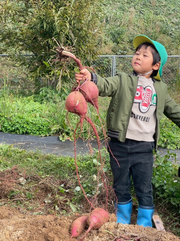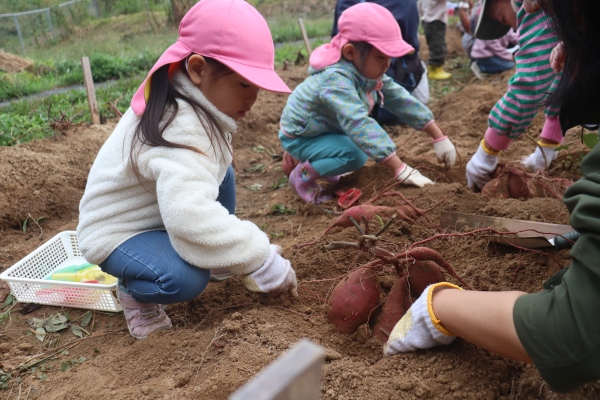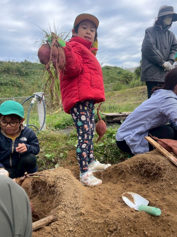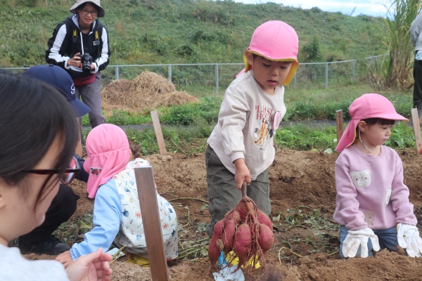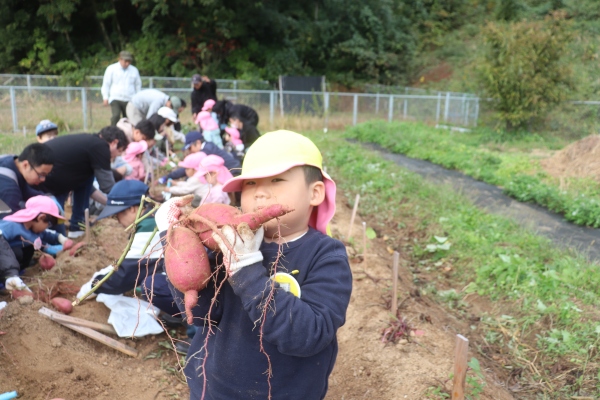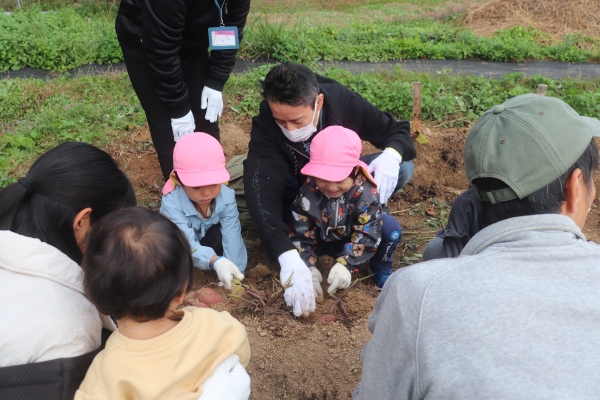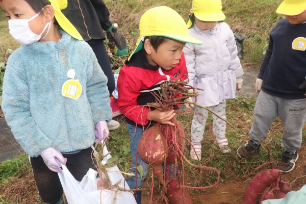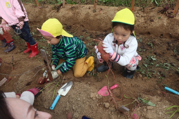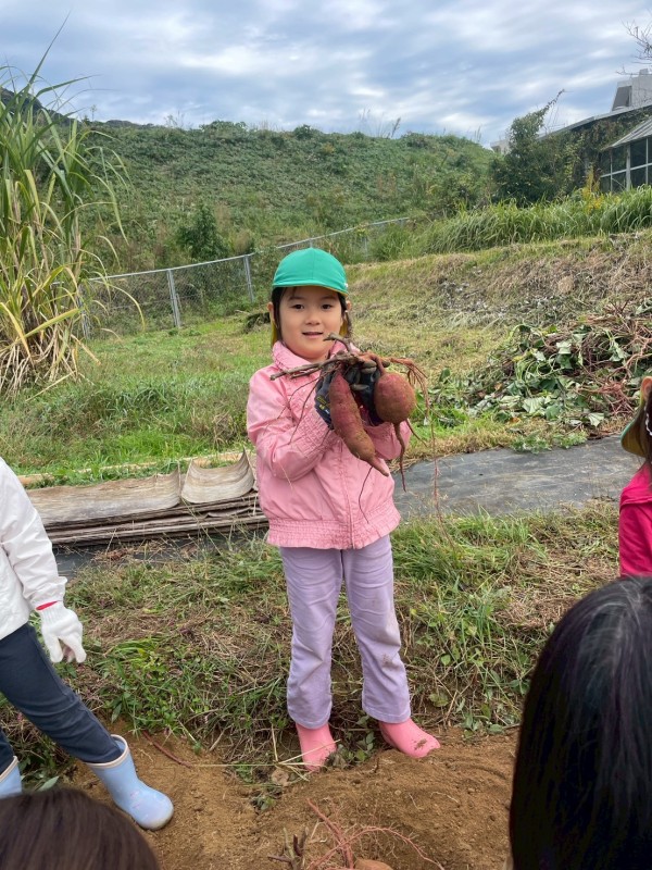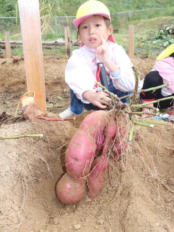 11月の親子での収穫では,掘っても掘っても出てくるたくさんのさつまいもに「おっき~い」「どんどん出てくるね」「もう持てない!」と大歓声,大満足でした。