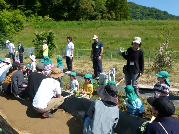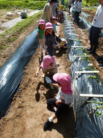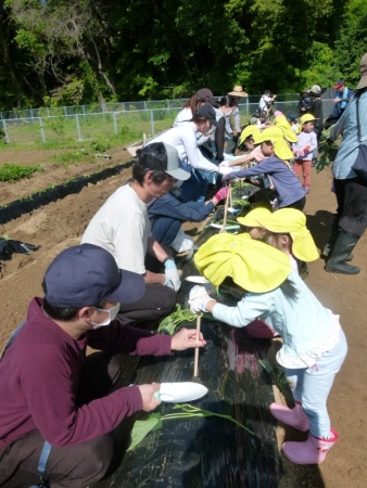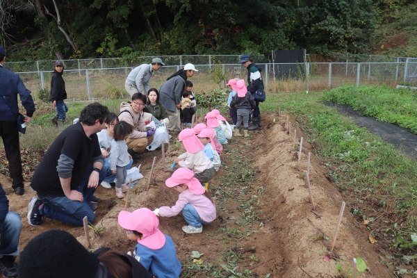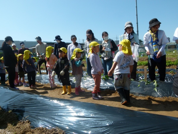 まずは,ちゅうりっぷ組とぽぷら組の集合です。ちゅうりっぷ組の子どもたちは,大学内での集合,初めて見る広い畑に緊張気味でしたが,平尾先生の丁寧な説明を聞きながら,無事植えることができました。ぽぷら組の子どもたちは,昨年,一昨年の経験から,すこし余裕をもって植えていました。