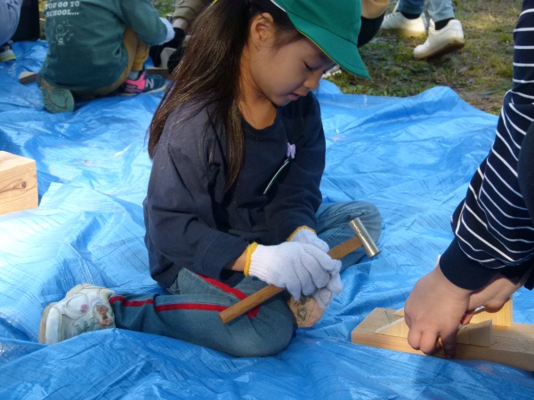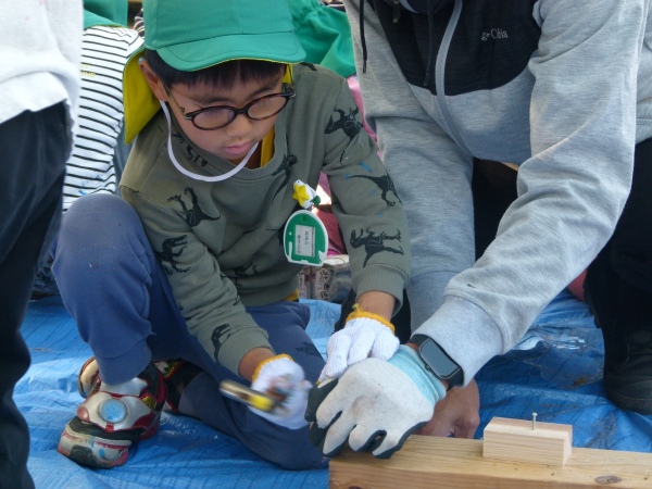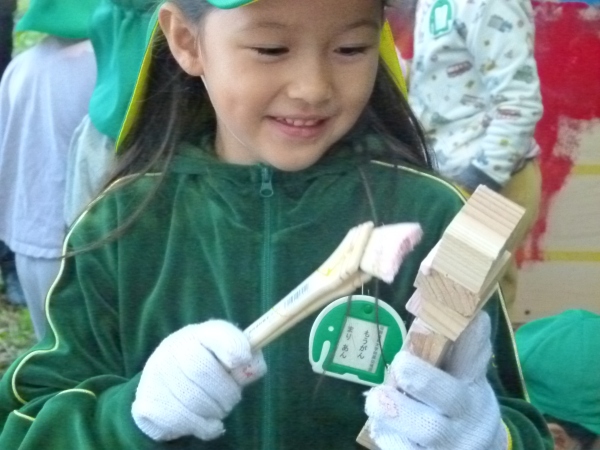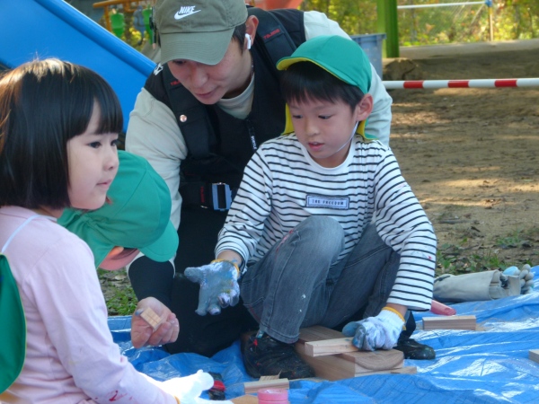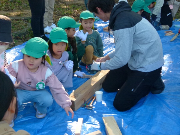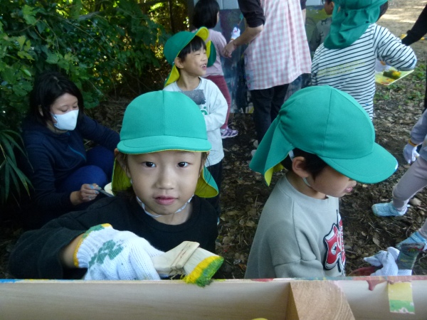 おやじの会,PTA研修部に加え,日替わりでお手伝いの方も加わり,園児の送迎の合間に,材木の買い出し,防腐剤塗布,組み立てと手際よく進みました。