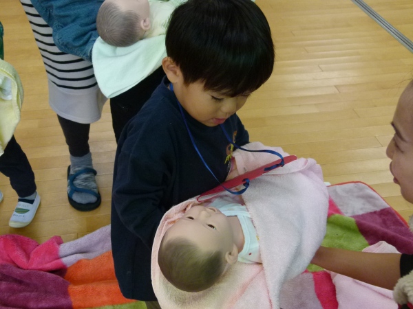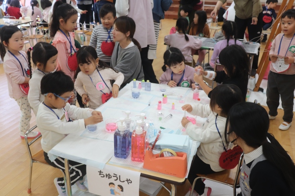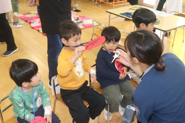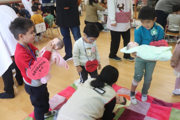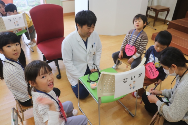 在園児保護者の医療関係者及びボランティアの方々のご協力のもと、内科・外科コーナー、聴診・血圧測定、点滴、赤ちゃん抱っこコーナー、白衣等試着コーナーなど様々なブースを用意し、子どもたちは順番にさまざまな体験を行いました。