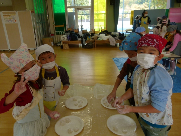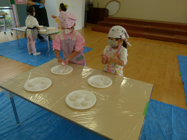 今度は,麹と潰した大豆をよく混ぜ,空気を抜きながら,団子にしました。空気を抜く様子に「ハンバーグつくるときみたい」と言う声も聞かれました。いつもの泥遊びの要領で,とても上手に丸めていました。