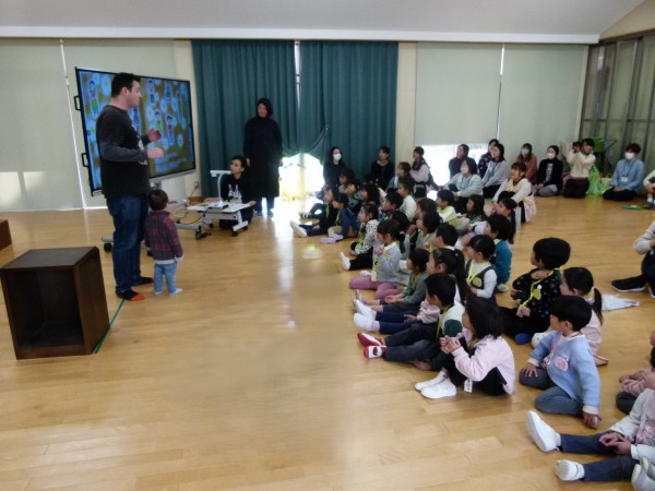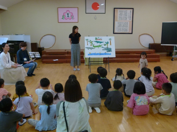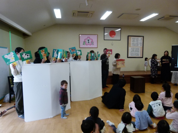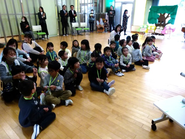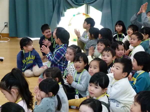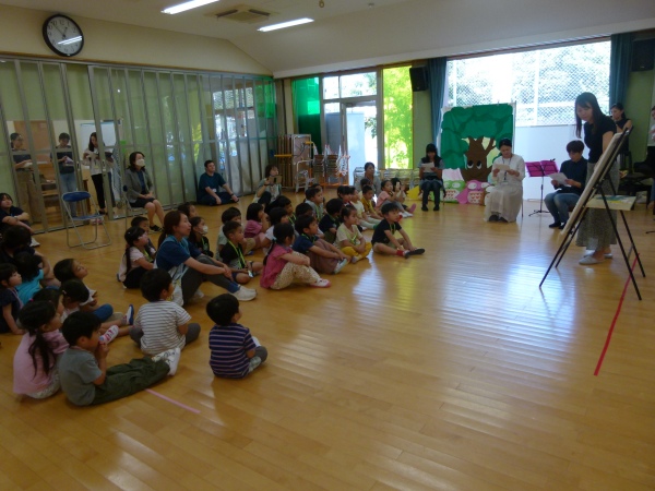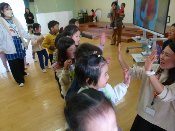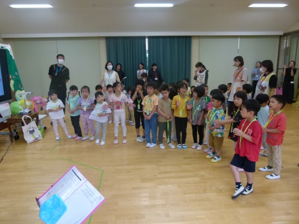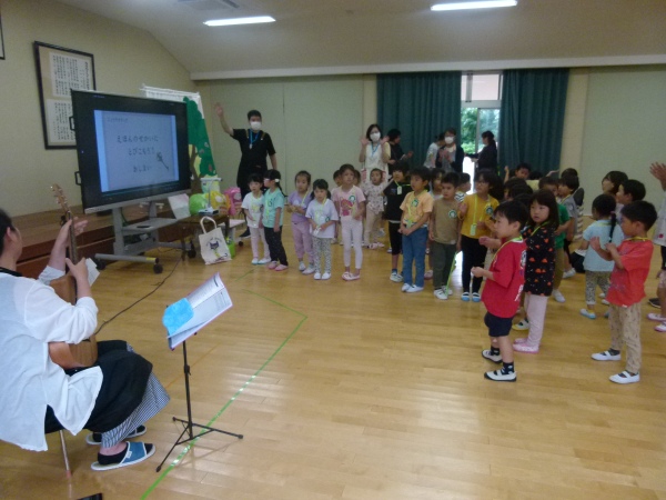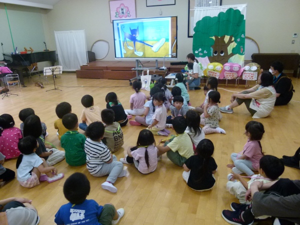 今回は,「ねこのピート」と「ニンジンジン」です。保護者の演奏に合わせ、テーマソングを聞いたり、絵本の挿入歌を合唱したりしながら、過ごしました。