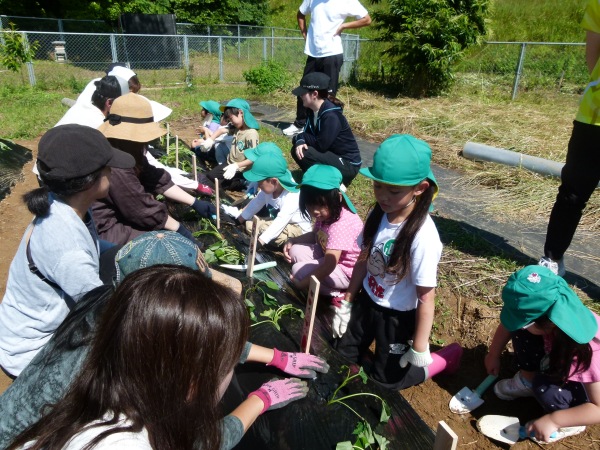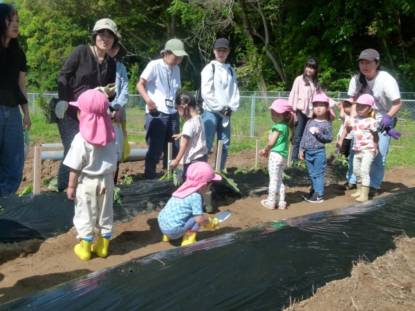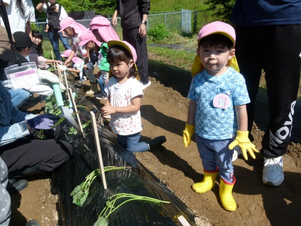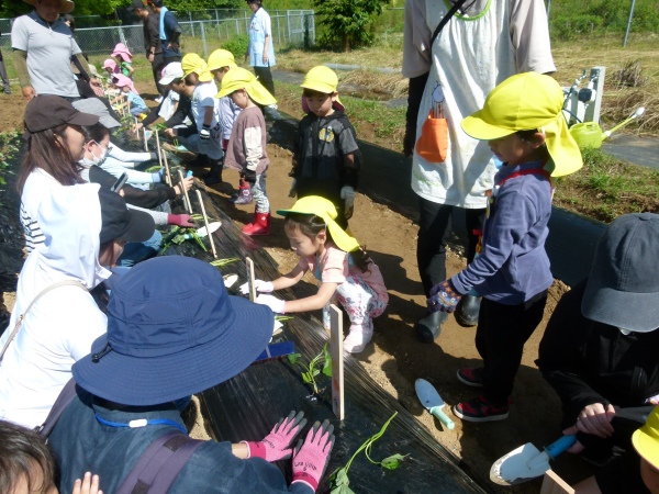 交代して,さくら組の子どもたちの集合です。昨年も芋苗植え,芋掘りで来たことのある畑に「前にも来たことあるね」と言いながら,お家の方と一緒に植えました。それぞれ,「おおきくなあれ!」と苗に声を掛けて,完了です。