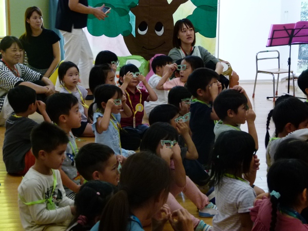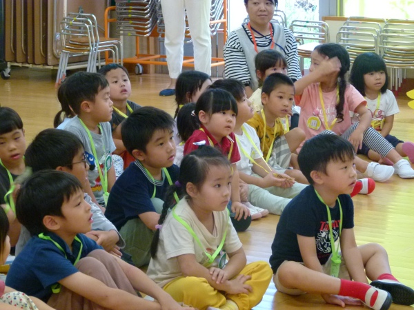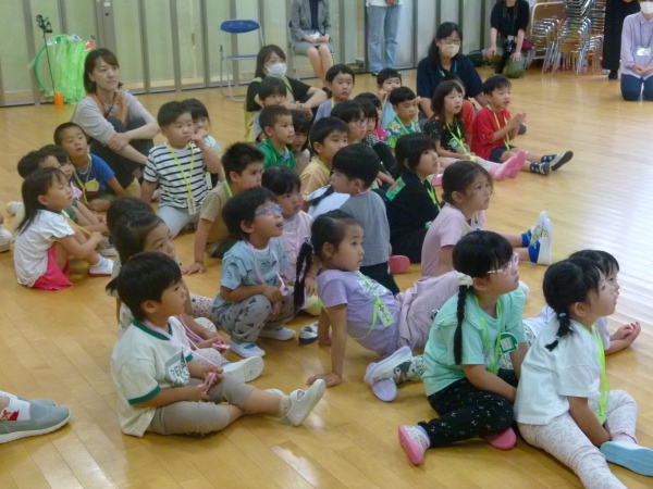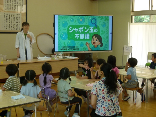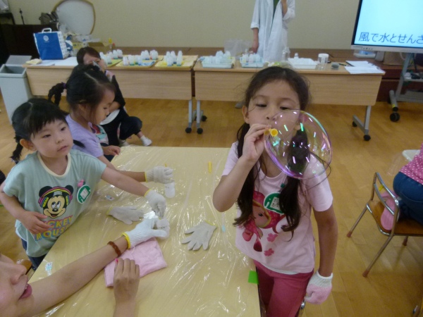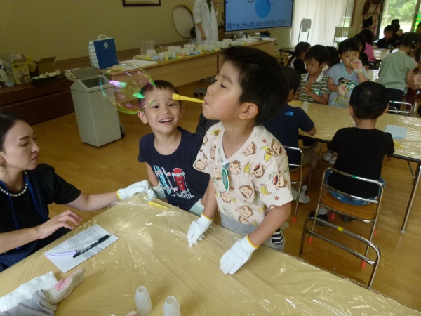途中には中本先生によるクイズもあり、子どもたちは積極的に手を挙げるなど、シャボン玉の不思議な世界に興味津々の様子でした。