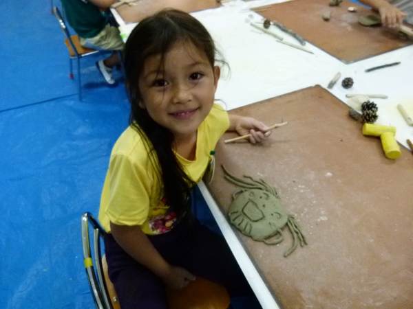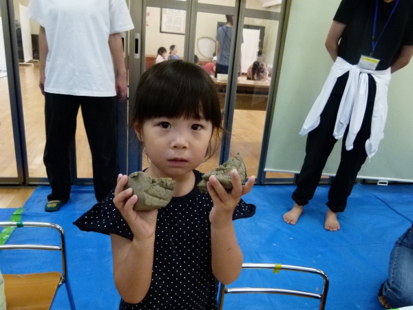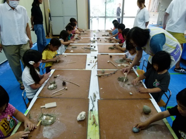 子どもたちは、与えられた土の手触りを楽しみながら、とても真剣にさまざまな形を作っていました。作品ができあがると、先生や補助のPTAに満足げに見せていました。それぞれの個性が光る素敵な作品ができあがり、完成した作品は、陶芸家の先生により後日焼き上げていただく予定です。